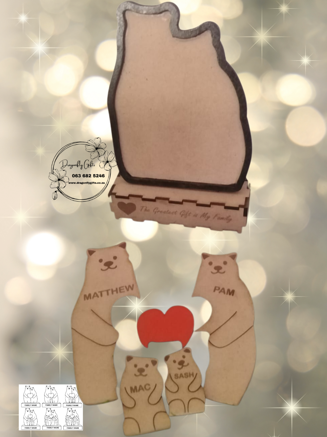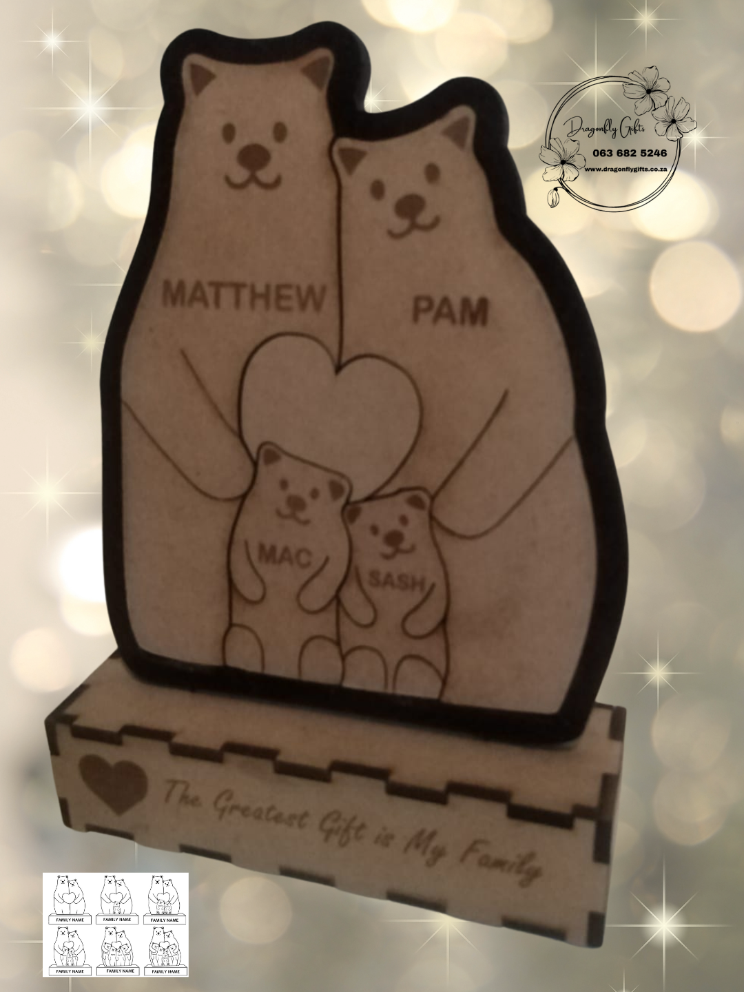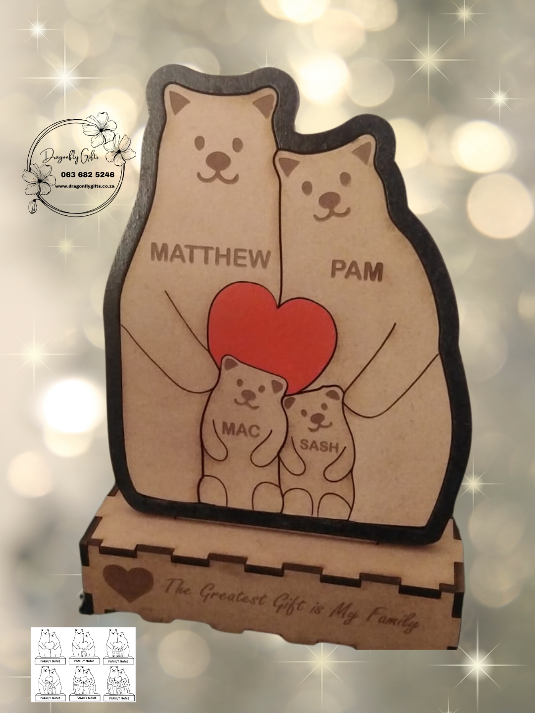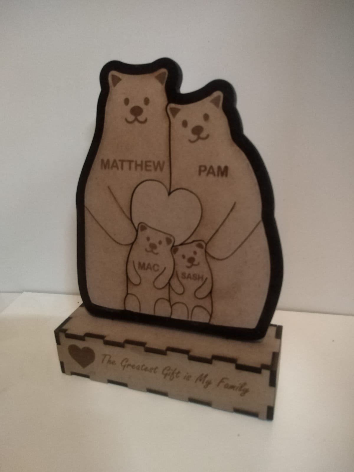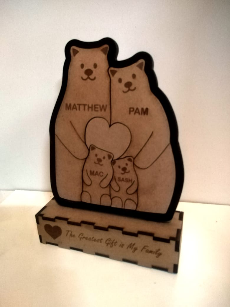 Each piece is laser-cut and engraved with your family’s names, beautifully designed to stand as a keepsake on a shelf, mantle, or bedside table.