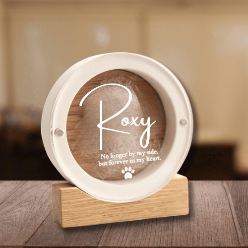 The Forever Close – Memory Ring holds a small keepsake—such as fur or a written note—safely enclosed behind clear acrylic. Designed to sit softly in your space, it’s a simple way to keep their presence close, every day.