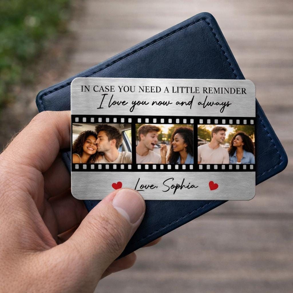This aluminum wallet card is made to stay with him — tucked into his wallet, quietly saying I’m thinking of you every time he sees it.